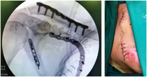 任海东、信远、吴学业手术团队先为患者进行了肩胛骨骨折的复位,术中采用Judet入路,见肩胛体部粉碎性骨折,给予复位,以直型和L型锁定接骨板用锁钉分别固定,活动右肩部见骨折基本稳定,肩关节内无弹响感。C型臂透视见右肩胛骨骨折轮廓基本恢复,内固定位置良好。