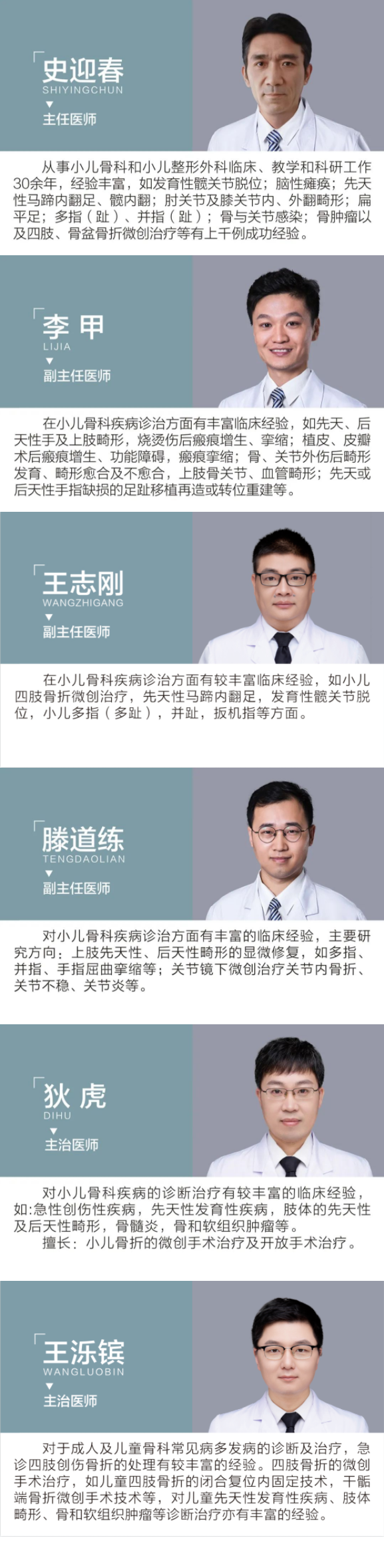 小儿骨科:四肢骨折及外伤后骨不连、骨盆骨折及其并发症、外伤后骨关节畸形愈合、急慢性骨髓炎、多指、并指。