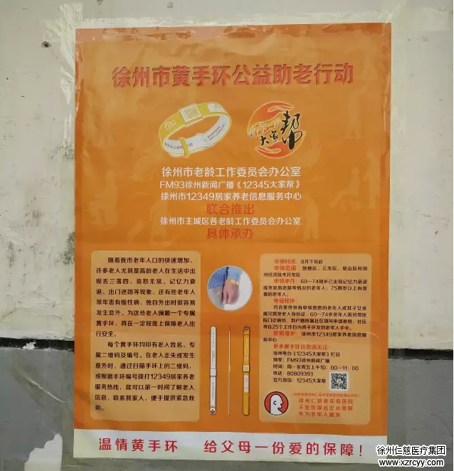 8月20号,市老龄办召开新闻发布会,联合新闻频率《12345大家帮》等多家媒体及12349居家养老服务中心,共同启动“黄手环”助老爱心公益活动。目前,首批3000个黄手环已被爱心企业徐州sararz老年病医院认购,“黄手环”关爱老年人行动正式启动。