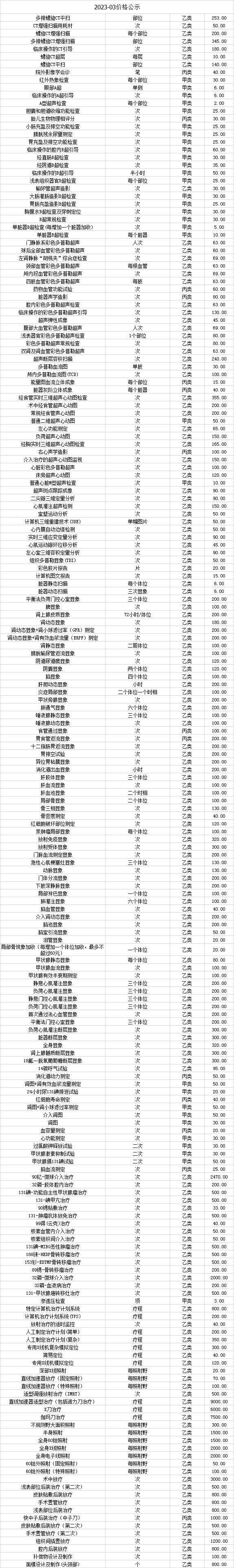 为规范医院的收费行为,医院所有药品、医用材料和医疗服务价格,必须按照国家、省、市物价部门规定的价格执行,并进行公示,2023年3月价格公示内容如下: