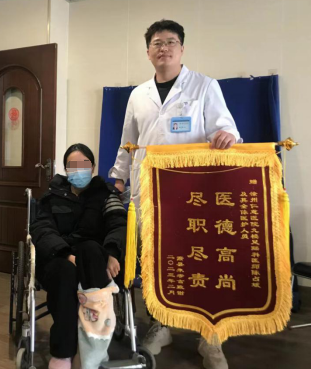 2023年1月,我院足踝外科一病区曹广超主任、陈占斌医生手术团队为一位18岁双侧高弓足畸形的女孩做了左侧矫形手术,手术很成功,术后3个月女孩再次来院复查的时候,为表达对医护人员的感谢,精心准备了一面锦旗送给他们。