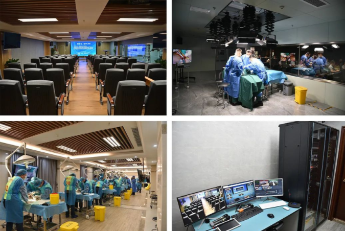 临床解剖实验室与医院手术室可实现音像数据双向实时传输,对手术全过程进行现场直播,实现在视听教学会议室、多媒体直播示教室和空中花园直播会议室与手术室的“四室互动教学”,通过网络数据传输各会议室学员可与手术室示教导师进行互动提问,解决传统示教障碍,提升教学效率,能同时满足300人的示教学习。