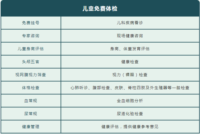 2、免费体检3、免费儿童生长发育评估、营养咨询及指导