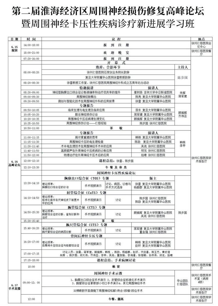 为进一步推动周围神经损伤修复领域的学科发展,加强周围神经及显微外科学领域之间的交流与学习,提高周围神经系统损伤诊断的准确程度、提高治疗效果,让更多优秀医师们深入学习臂丛及周围神经损伤的诊治,6月16-17日betway在线登陆与复旦大学附属华山医院手外科联合举办“第二届淮海经济区周围神经损伤修复高峰论坛暨周围神经卡压性疾病诊疗新进展学习班”。