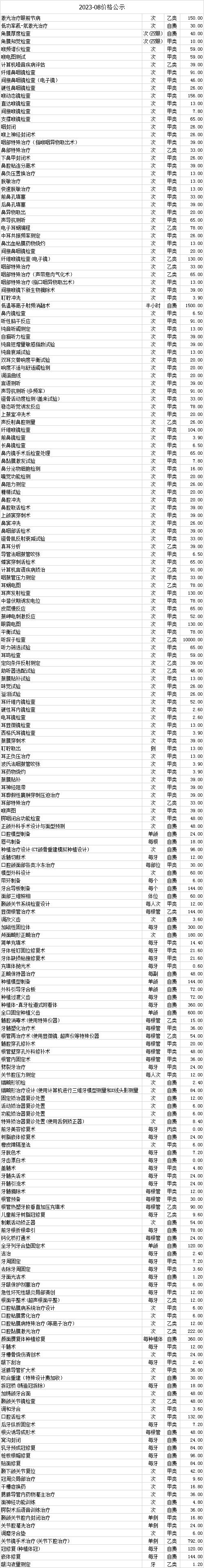 为规范医院的收费行为,医院所有药品、医用材料和医疗服务价格,必须按照国家、省、市物价部门规定的价格执行,并进行公示,2023年8月价格公示内容如下: