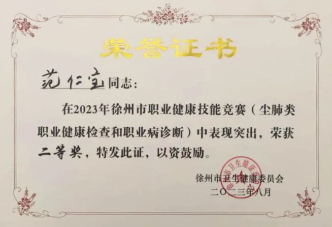 这次竞赛由徐州市卫生健康委员会和徐州市总工会共同主办,市疾病预防控制中心、市卫生监督所、市职业病医院承办,共有16支代表队参加,参赛队员共计75人。betway在线登陆代表范仁宝凭借精湛的业务技能和出色的表现,在竞赛中脱颖而出,荣获二等奖,充分展现了医院职业健康工作者的业务水平和风采。