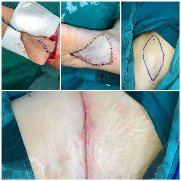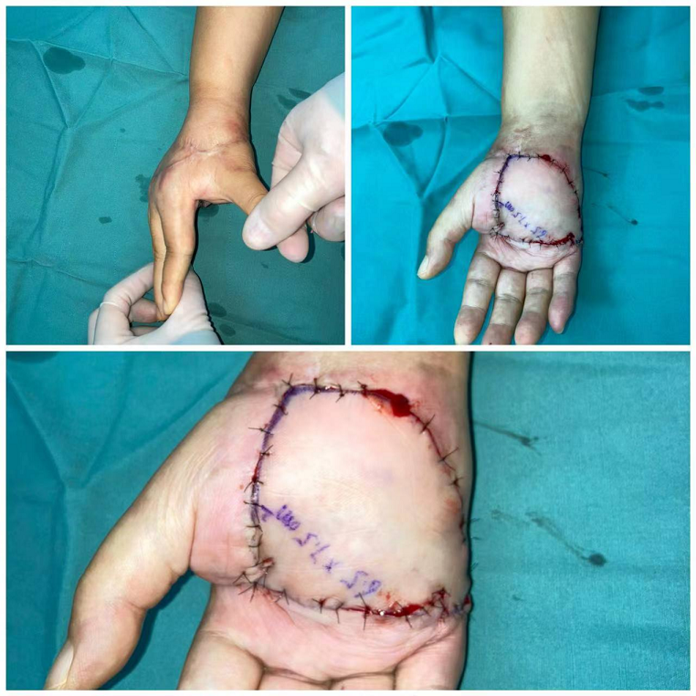 对于严重手部瘢痕挛缩,腹部带蒂皮瓣修复后制动时间较长,需要二次手术断蒂,患者接受度较低。游离皮瓣是修复手部皮肤软组织缺损的理想选择[,但传统皮瓣修复术后外观较臃肿,在手部等皮下软组织较薄的区域存在功能重建效果不理想的问题。此外,皮瓣切取后供区存在麻木、感觉障碍、等并发症发生风险。为此,足底内侧皮瓣实现了手足同源,完美修复,最大程度减少皮瓣供区并发症,成为临床关注问题。手术松解瘢痕挛缩后,切取足底内侧穿支皮瓣修复创面,获得较好疗效。