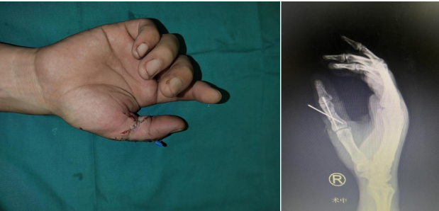 术中发现拇指拇长屈肌腱、指伸肌腱、尺桡侧动脉及神经均有不同程度的断裂,血管神经肌腱断端不齐。在修整伤口皮缘,清除污染失活组织后复位拇指骨折断端,进行固定,C臂透视见骨折断端对位对线良好。在10倍显微镜下游离修剪臃余脂肪组织,游离找出拇指断裂的上述血管神经用特殊丝线吻合断裂的血管,修复神经后手术顺利结束。