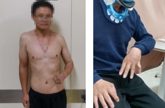 图左:脑外伤手术后7年,左侧屈肘、屈腕屈指痉挛图右:手术后屈指及屈肘痉挛改善明显