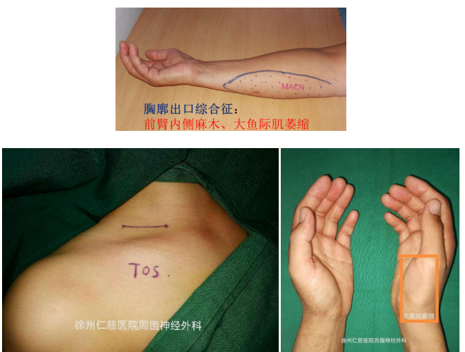 胸廓出口综合征 臂丛神经在锁骨上部受压,表现为患肢酸痛不适、无力、怕冷、麻木,手尺侧及前臂内侧感觉障碍,手指分开合拢无力,精细动作受限,手内肌萎缩。