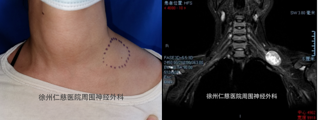 神经源性肿瘤:四肢、颈部、锁骨上下等部位可触及包块,用手指敲击后出现肢体麻木、酸痛等症状,当肿块较大时可出现持续性麻痛,肢体无力,甚至功能丧失。一般超声及磁共振检查可以很好协助诊断。