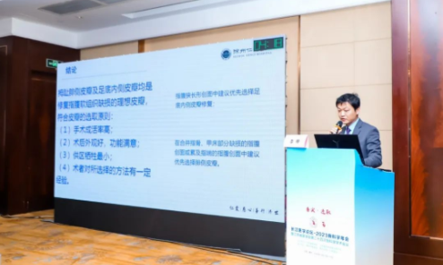 陈占斌作《植皮预构皮瓣修复足踝部皮肤脱套缺损的临床应用》专题报告