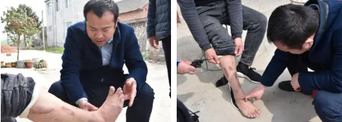 这次家访的时候,赵大叔通过锻炼已经具备了踝关节正常跖曲和背伸的功能,曹广超主任通过查体发现小腿肌肉力量仍有不足,后续还要通过锻炼来加强小腿肌肉的力量。