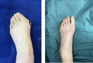 曹广超主任了解了李阿姨的情况后,通过检查发现两只脚的前足部分变宽,第一跖骨头内侧、第五跖骨头外侧突出、皮肤红肿。现在医院进行的第四代微创拇外翻矫正手术,除了微创外,进行三维畸形矫正,更好保护组织,更有利于术后早期恢复。