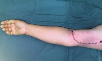随后,郑大伟、陈相丞手术团队为张阿姨进行了右上臂肿瘤切除术,9cm*3cm*3cm的肿瘤被成功切除,术中仅出血10ml,手术顺利完成,术后予放疗对症治疗。