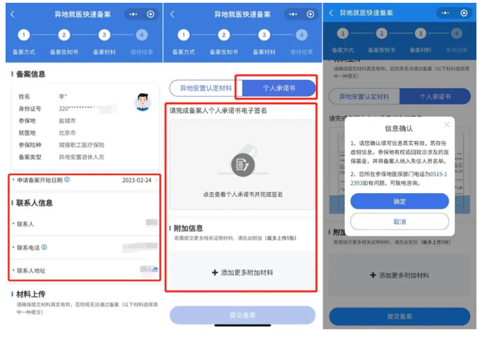 有些地区允许参保人通过个人承诺的方式办理备案,符合条件的参保人无法提交认定材料时,可以点击“个人承诺书”,按要求完成签名后,点击“提交备案”按钮,完成备案申请。