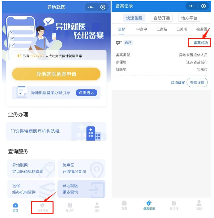 点击首页【备案记录】按钮,进入异地就医备案记录页面,实时查看备案进度。
