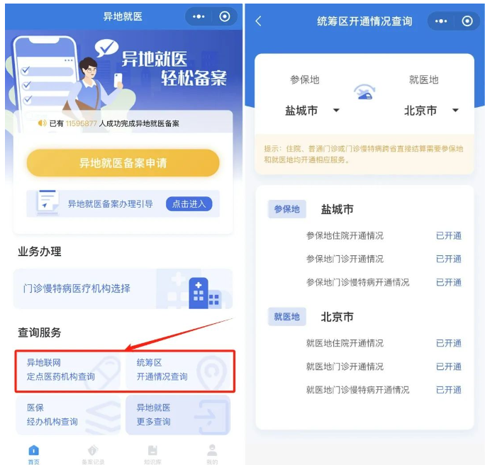 除了申请备案外,参保人还可以在小程序查询各统筹区及异地联网定点医药机构的开通情况。