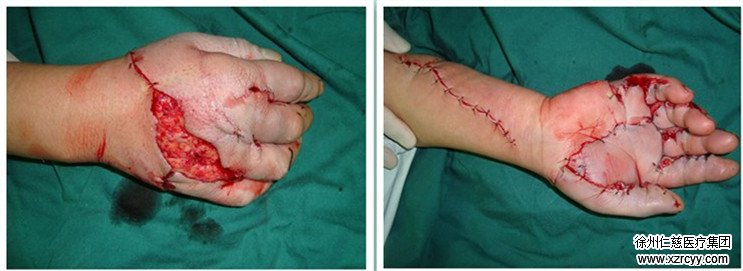 朱女士的主治医生胡俊生介绍:“病人入院时,右手1-5指脱套性离断,就像脱手套一样,手心手背的皮肉都与骨头分离。我们考虑到再植。”