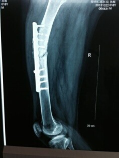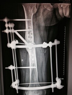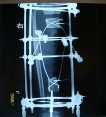 病例二:患者孙X,男,18岁,一年半前因外伤致右股骨骨折于外院行“右股骨骨折切开复位钢板内固定术”,术后复查骨折一直未愈合,四月前复查X片示右股骨内固定螺钉断裂。来我院检查以“右股骨术后骨不连 右股骨内固定螺钉断裂”收住入院(图一),于2013年10月26日在全麻下行“右股骨内固定取出+环形架外固定术”。术后患者可以带架行走,2014年02月22日复查已见骨折线模糊,骨痂生长连续。已经达到临床愈合标准(图二)。