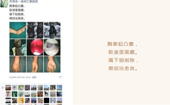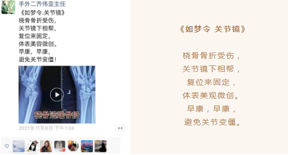 齐伟亚主任爱好作诗,同事们常常跟他开玩笑说:“齐主任,您如果生在古代,一定是位现实主义诗人”。原来,下班后齐主任常常在朋友圈发表关于腕关节镜微创手术的诗词,和同事们及同道探讨交流疑难复杂病例,这是他生活的一大乐趣。