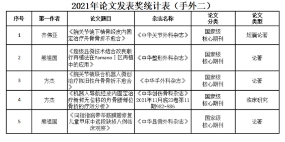 在齐伟亚主任的带领下,科室也形成了团结、奋进、和谐、快乐的文化氛围,科室成员在各自专业领域钻研进取。熊祖国的《超级显微外科技术从动物实验到YamanoⅠ区(指尖)再植临床应用的转化研究》获徐州市医学引进新技术二等奖、《撬拨复位微创治疗难复性儿童尺桡骨远端骨折的研究》当选院级课题。2021年全科共发表国家级论文5篇。