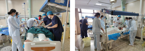 紧接着,一场与死神的生命争夺战开始了。黄主任评估伤情后,启动烧伤急救的应急预案,快速建立可靠静脉通道,深静脉置管,抗休克补液,动脉置管动态检测血压,密切监护患者生命体征,而后再进行气管切开术,确保气道通畅,留置导尿,动态检测每小时尿量,指导液体复苏。