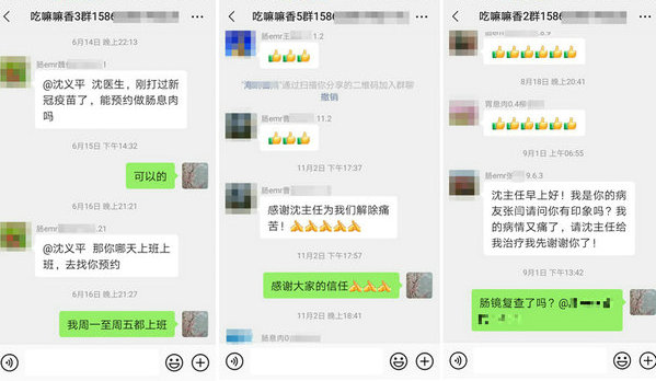 消化内科病房里,刚做完内镜下黏膜切除术的吴先生(化名)今天准备出院了。沈义平主任查房时掏出自己的手机打开群二维码。“微信有的吧?来,扫码进群。”“群?啥群?”“吃嘛嘛香群,让您术后吃嘛嘛香!群里都是做完手术或者需要做手术的患者朋友,昵称给您改成手术名+您的名字+手术时间,这相当于患者的小档案了,我一看就知道您的情况了。回家后有啥问题或者不舒服了,随时可以在群里问,我或者我们团队医生都会尽快回复。”沈主任给吴先生解释进群的用意。